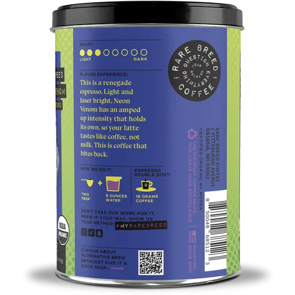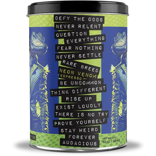 Neon Venom Coffee is the espresso that breaks all the rules. Light, bright, and full of punch, this renegade roast delivers unexpected intensity. Defying expectations of a typical light roast, it excels in milk-based drinks, effortlessly driving rich, bold flavors through creamy textures. Whether you're craving a bright espresso shot or a smooth latte, Neon Venom amps up the experience with its lively, full-bodied flavor.