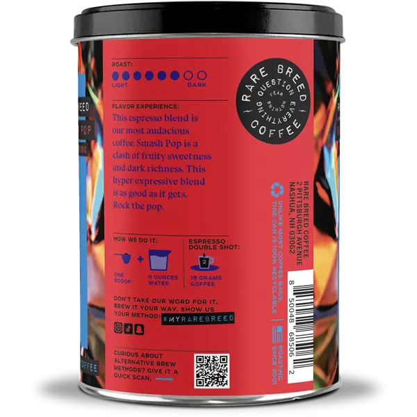 Introducing Smash Pop Espresso, our most audacious coffee yet. This espresso blend is a bold clash of fruity sweetness and dark richness, creating a hyper-expressive experience that defines what big, bright, and bold coffee should be. Get ready to rock your taste buds!